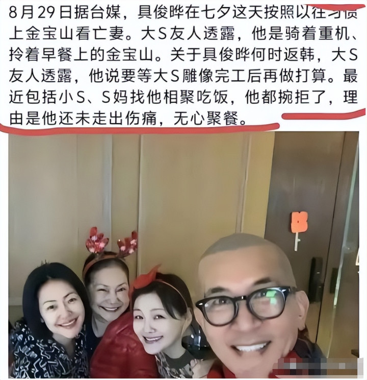 具俊晔的转变尤为明显,起初他频繁出现在大 S 的墓地,七夕节时还带着两人的亲密合照、妻子喜欢喝的咖啡和面包前往祭拜,甚至亲自参与大 S 雕像的设计,图纸都由他亲手绘制,S 妈也曾多次称赞他重情重义。